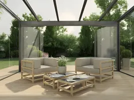 Rahmenlose Glas-Schiebewände schützen zuverlässig vor Wind und Regen, ohne die freie Sicht einzuschränken.